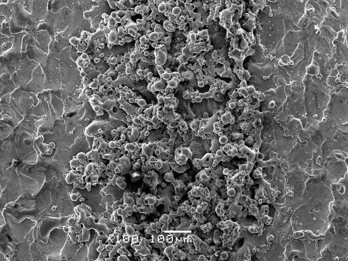 极间一旦输入较大放电能量,放电形成的高温必然导致极间有限的工作介质大量汽化,致使极间缺乏工作介质,导致无法进行正常放电,极间形成烧伤,切割效率无法再随脉冲能量的增加而继续提高,且工件表面的烧伤也会导致对应点的电极丝表面形成损伤,电极丝损伤的累计会导致断丝几率大大增加。其极间状态示意和工件表面烧伤处的微观照片如图 1 所示。