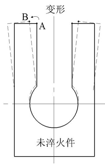 合金工具钢开口型零件经线切割加工后必然会产生开口的扩张或收缩,其变形方向与材料是否淬火有直接的关系,而扩张或收缩变形量的大小则与材料的厚薄及零件的开口深度及形状密切相关。图1为一典型深开口零件及其变形示意图。