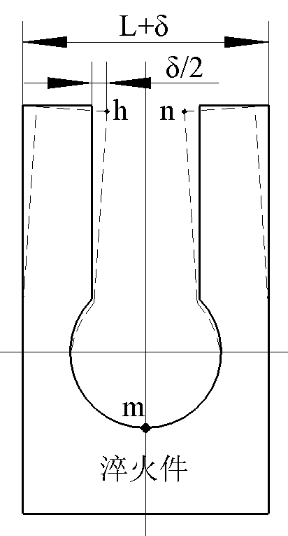 首先,由于工件上段开口方向会形成整体的向内收缩δ,因此在工件下料时宽度尺寸应为原来的实际值L加上切割后向内的变形收缩量δ,即L+δ。