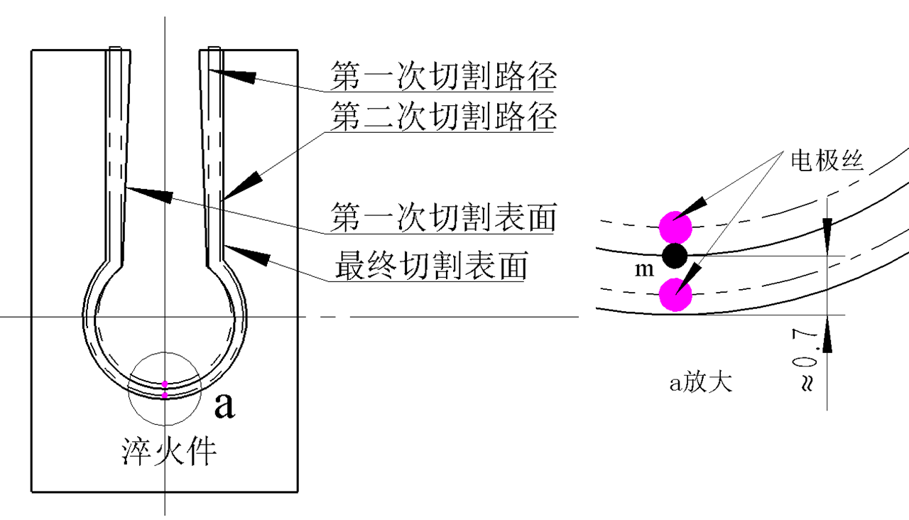 其次,为获得精确的开口尺寸精度和均匀的表面质量,需要采用两次切割的方式,但在第二次切割时,仍然需要保障电极丝在切缝中切割,因此在变形量最少的m点,需要在一次切割后留有0.7mm左右的切割余量(设电极丝直径𝜑0.18mm,第二次切割去除的薄片厚度为0.5mm,单边放电间隙0.01mm)。第一次切割电极丝至少偏离原有的轨迹0.7mm,从而使得工件充分变形,而后再按原来的轨迹切割,保障开口尺寸,如图2(b)所示。