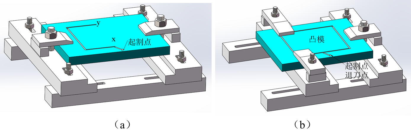 对凸模而言,采用二次装夹法,如图6.23(a)所示。当线切割加工从x点顺时针加工到y点时,松开左侧横梁,把横梁移到靠近 x、y 点的位置,并用压板夹住凸模左侧两头,如图6.23(b)所示。