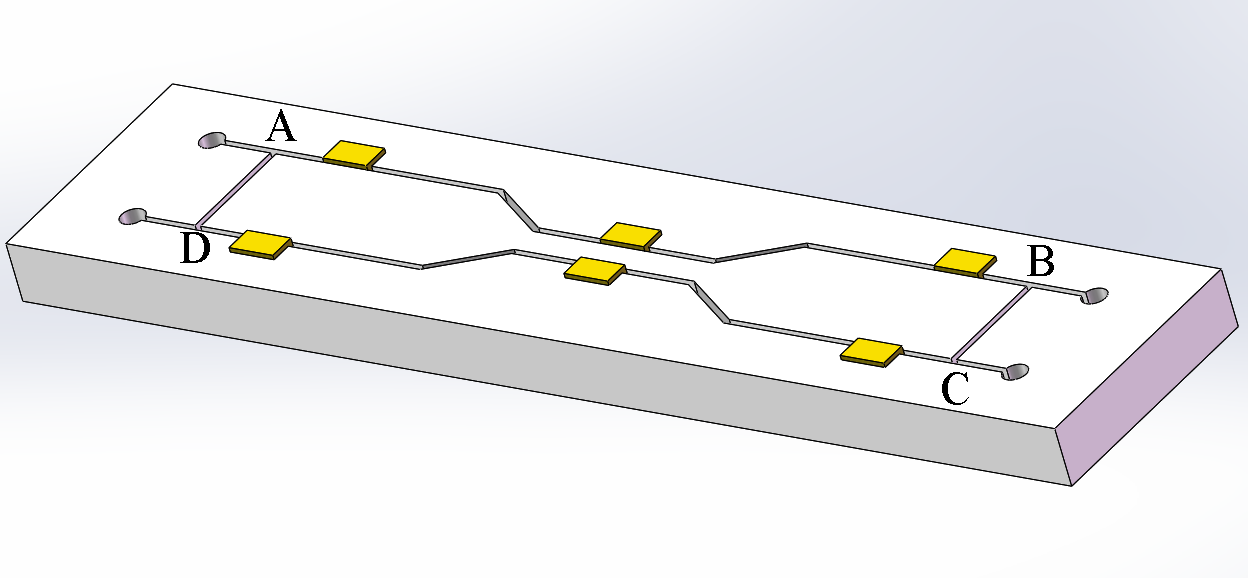 因此从改变加工工艺着手,由以往的切割一个凸模,只用一个穿丝孔改为切割两个“凹模”,并用四个穿丝孔进行,如图2所示。将以前的一个完整轮廓程序编制成四段小程序,即把一个封闭的轮廓分解成四个开口轮廓,先加工零件的长度方向,如图2的AB段和CD段,利用坯料本身拉住两边,避免凸模成为悬臂梁,减少了模具的变形;然后在零件两边及中间的切缝里塞上铜皮,并用粘合剂如502 胶固定好,而后再加工宽度方向的AD 段和 BC 段,通过插入的导电铜片及502胶固定住凸模,防止其在切缝内产生变形,以此限制了凸模的变形。