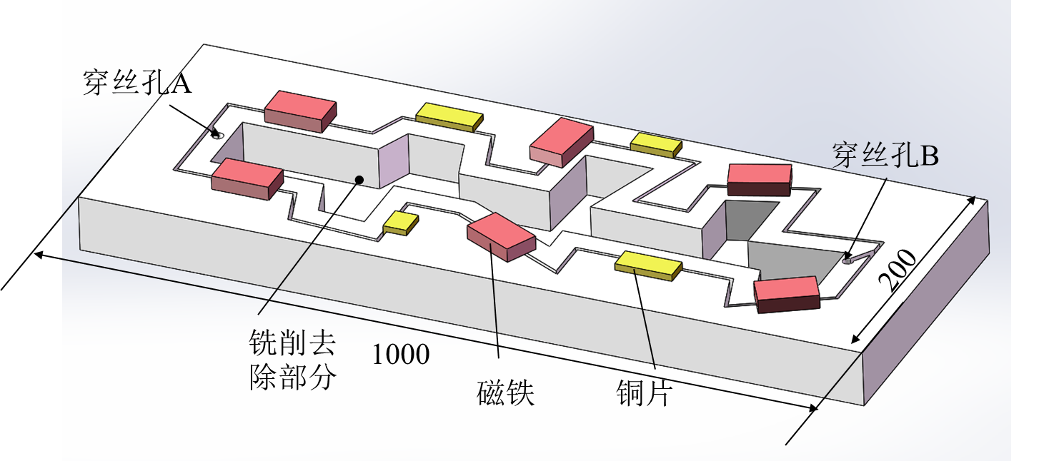 图1为长窄型复杂形状凹模,这类模具的特点是:长边与窄边尺寸相差较大,模具质量大,且去除量大,由于是长窄型复杂形状,切割后变形大,因此,对于此类模具切割应该注意以下几点: