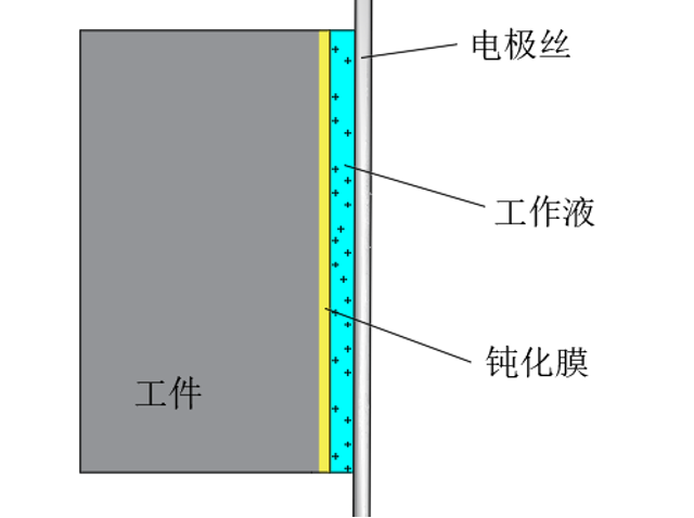 对于这类材料的切割,工作液的选择是能否顺利切割的核心,由于切割速度很低,加工不稳定,因此在加工过程中必然存在比例较高的空载波,而空载波的存在会使极间出现电化学反应,此时如果工作液具有较高的电导率,则极易在工件表面因为电化学作用形成一层绝缘钝化膜,如图1所示。