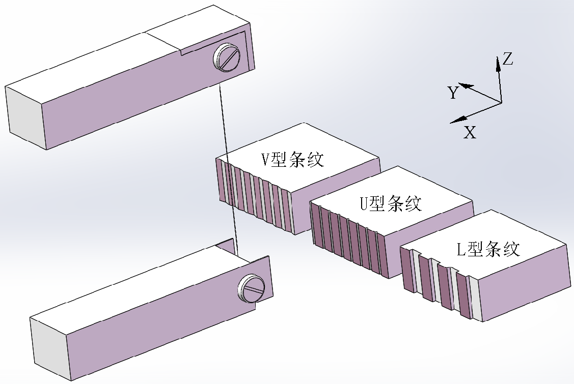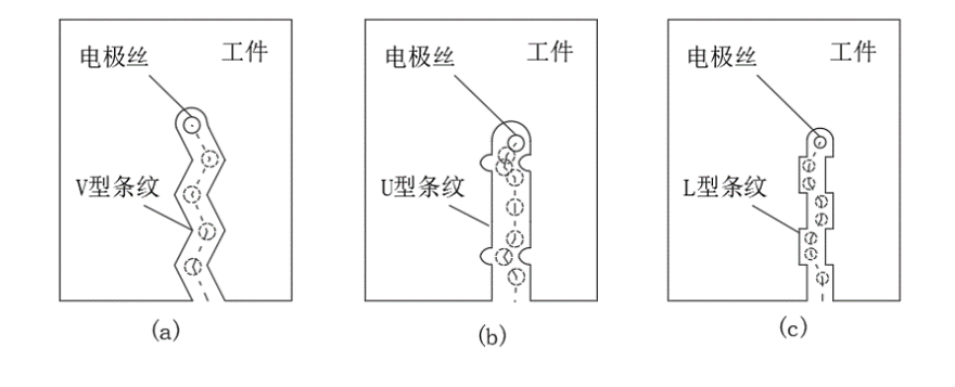 线切割表面出现的周期性贯穿条纹,一般都是由于电极丝空间位置变化而产生的,后者主要是由导轮或贮丝筒与电极丝间张力的变化引起的。形成贯穿条纹的原因很多,不同原因将导致不同形状的条纹,并且条纹主要是在切割Y方向时出现。条纹主要包括V型条纹、U型条纹、L型条纹及叠加型条纹等4种形式,图1为电极丝空间位置与条纹类型示意图。