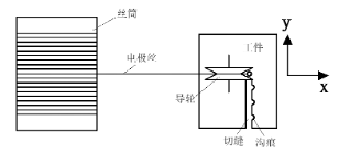 ③ U型条纹出现的另外一种原因是在线切割加工中,贮丝筒两端原来不参与加工的电极丝,由于异常原因进入加工区域造成的。正常情况下贮丝筒两端有少部分电极丝用于换向时的缓冲过渡,贮丝筒中间大部分参加放电加工的电极丝由于不断的损耗,其线径小于缓冲过渡部分的电极丝。如果控制换向限位开关的作用时间或所定位置不变的话,则当换向断高频前经过被加工件的电极丝的线径不变,但如果因某种原因使限位开关没有及时动作,那么没有损耗过的电极丝就会进入加工区域,因为该部分的电极丝较粗,就会产生如图3所示的沟痕。另外由于导轮底部的限制作用,其左侧的放电位置不会左移,因此左边切割面上比较平整。